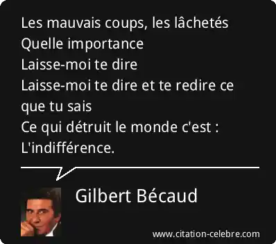 Les mauvais coups, les lâchetésQuelle importanceLaisse-moi te direLaisse-moi te dire et te redire ce que tu saisCe qui détruit le monde c'est :L'indifférence.