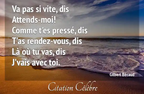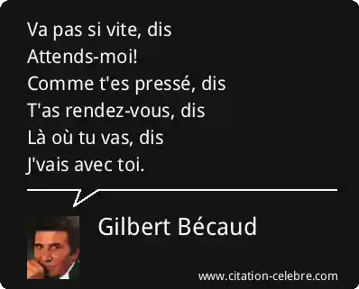Va pas si vite, disAttends-moi!Comme t'es pressé, disT'as rendez-vous, disLà où tu vas, disJ'vais avec toi.
