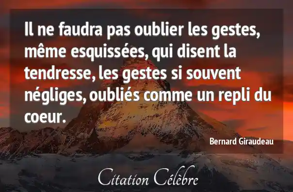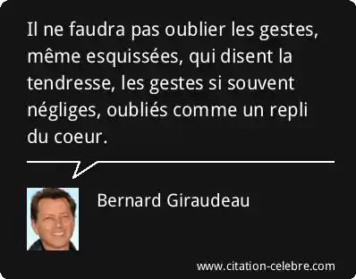 Il ne faudra pas oublier les gestes, même esquissées, qui disent la tendresse, les gestes si souvent négliges, oubliés comme un repli du coeur.