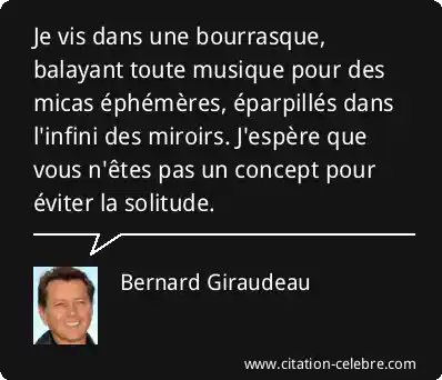 Je vis dans une bourrasque, balayant toute musique pour des micas éphémères, éparpillés dans l'infini des miroirs. J'espère que vous n'êtes pas un concept pour éviter la solitude.