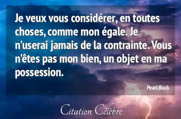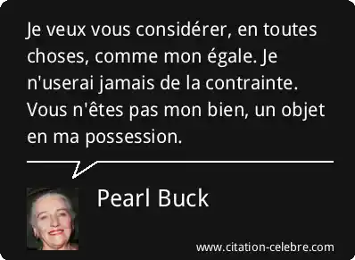 Je veux vous considérer, en toutes choses, comme mon égale. Je n'userai jamais de la contrainte. Vous n'êtes pas mon bien, un objet en ma possession.
