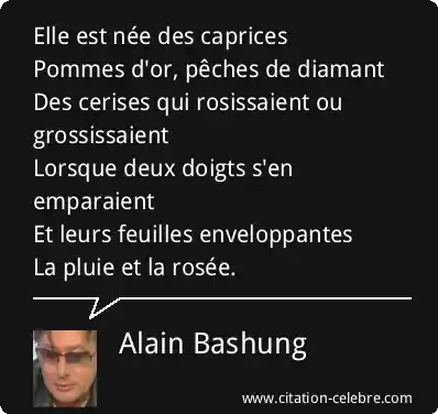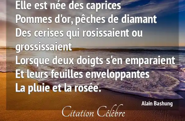 Elle est née des capricesPommes d'or, pêches de diamantDes cerises qui rosissaient ou grossissaientLorsque deux doigts s'en emparaientEt leurs feuilles enveloppantesLa pluie et la rosée.