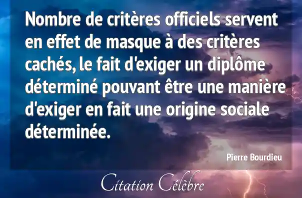 Nombre de critères officiels servent en effet de masque à des critères cachés, le fait d'exiger un diplôme déterminé pouvant être une manière d'exiger en fait une origine sociale déterminée.