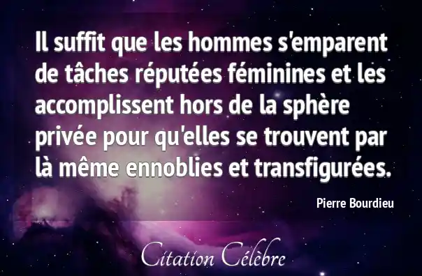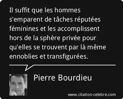 Il suffit que les hommes s'emparent de tâches réputées féminines et les accomplissent hors de la sphère privée pour qu'elles se trouvent par là même ennoblies et transfigurées.