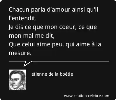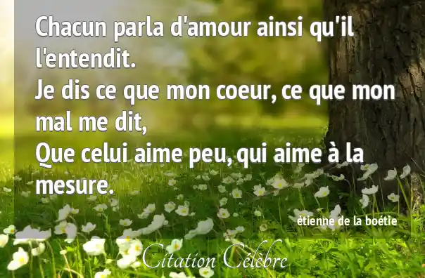 Chacun parla d'amour ainsi qu'il l'entendit.Je dis ce que mon coeur, ce que mon mal me dit,Que celui aime peu, qui aime à la mesure.