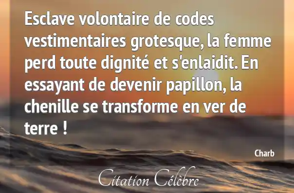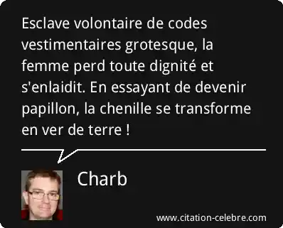 Esclave volontaire de codes vestimentaires grotesque, la femme perd toute dignité et s'enlaidit. En essayant de devenir papillon, la chenille se transforme en ver de terre !
