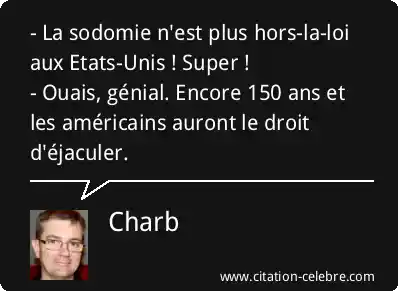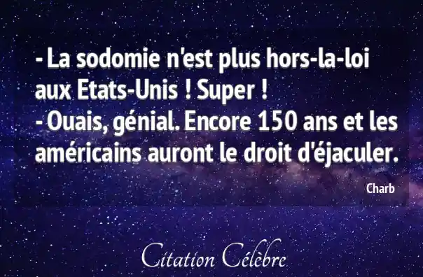 - La sodomie n'est plus hors-la-loi aux Etats-Unis ! Super !- Ouais, génial. Encore 150 ans et les américains auront le droit d'éjaculer.
