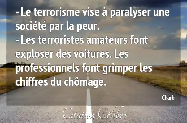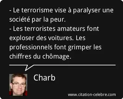 - Le terrorisme vise à paralyser une société par la peur.- Les terroristes amateurs font exploser des voitures. Les professionnels font grimper les chiffres du chômage.
