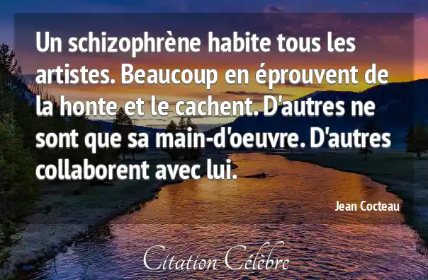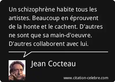 Un schizophrène habite tous les artistes. Beaucoup en éprouvent de la honte et le cachent. D'autres ne sont que sa main-d'oeuvre. D'autres collaborent avec lui.