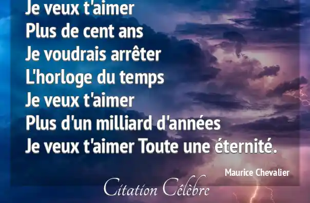 Je veux t'aimer Plus de cent ans Je voudrais arrêter L'horloge du temps Je veux t'aimer Plus d'un milliard d'années Je veux t'aimer Toute une éternité.