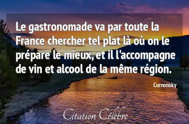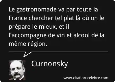Le gastronomade va par toute la France chercher tel plat là où on le prépare le mieux, et il l'accompagne de vin et alcool de la même région.