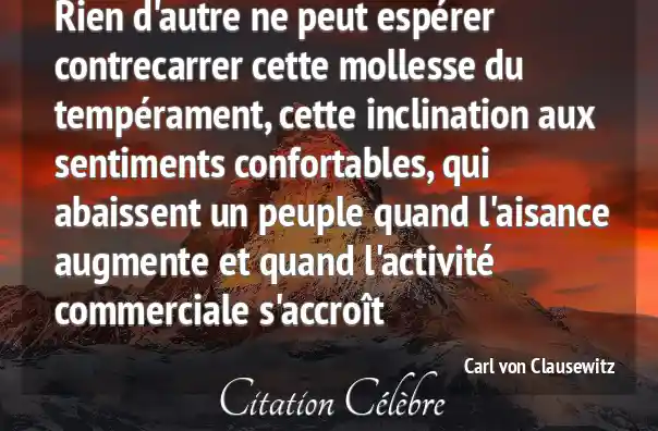 Rien d'autre ne peut espérer contrecarrer cette mollesse du tempérament, cette inclination aux sentiments confortables, qui abaissent un peuple quand l'aisance augmente et quand l'activité commerciale s'accroît