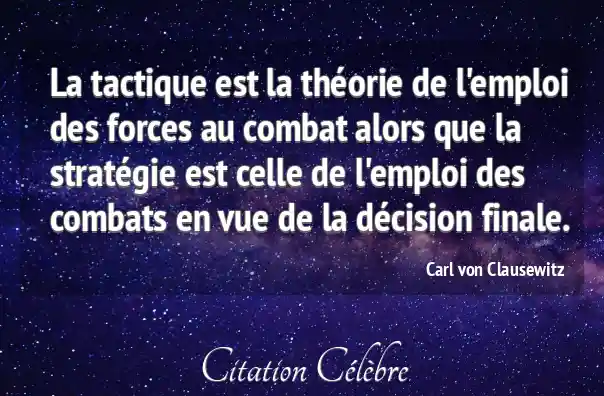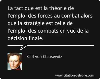 La tactique est la théorie de l'emploi des forces au combat alors que la stratégie est celle de l'emploi des combats en vue de la décision finale.