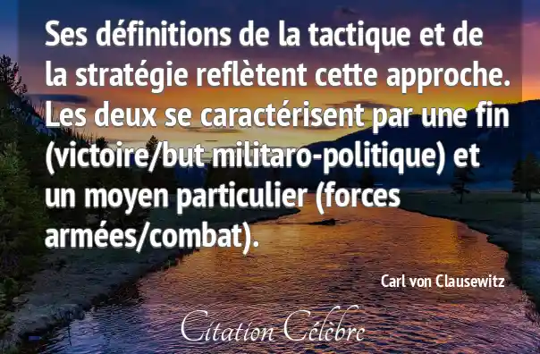 Ses définitions de la tactique et de la stratégie reflètent cette approche. Les deux se caractérisent par une fin (victoire/but militaro-politique) et un moyen particulier (forces armées/combat).