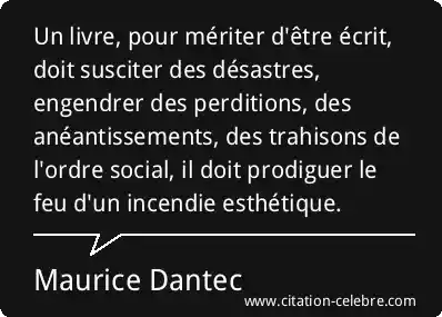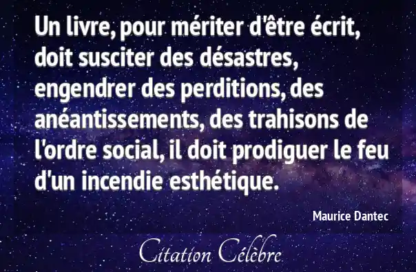 Un livre, pour mériter d'être écrit, doit susciter des désastres, engendrer des perditions, des anéantissements, des trahisons de l'ordre social, il doit prodiguer le feu d'un incendie esthétique.