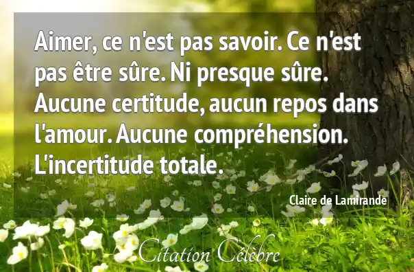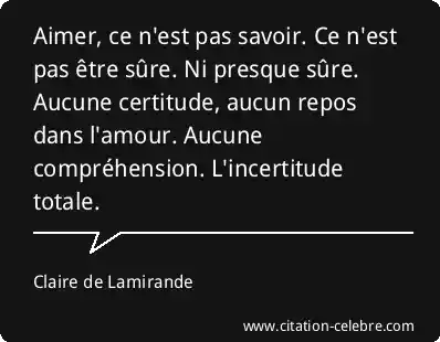Aimer, ce n'est pas savoir. Ce n'est pas être sûre. Ni presque sûre. Aucune certitude, aucun repos dans l'amour. Aucune compréhension. L'incertitude totale.