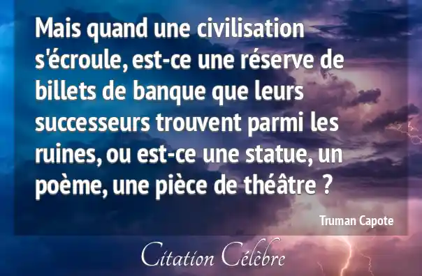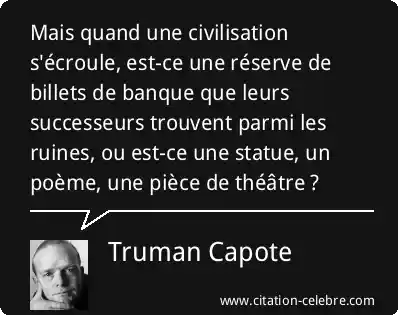 Mais quand une civilisation s'écroule, est-ce une réserve de billets de banque que leurs successeurs trouvent parmi les ruines, ou est-ce une statue, un poème, une pièce de théâtre ?
