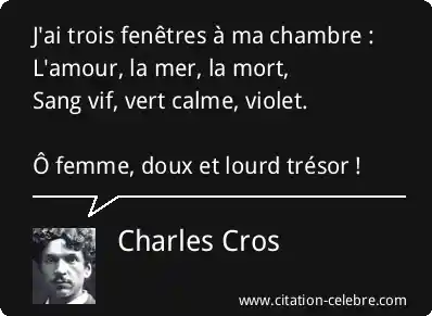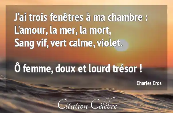 J'ai trois fenêtres à ma chambre :L'amour, la mer, la mort,Sang vif, vert calme, violet.Ô femme, doux et lourd trésor !