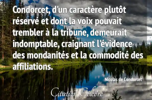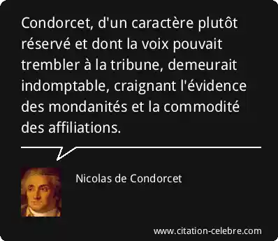 Condorcet, d'un caractère plutôt réservé et dont la voix pouvait trembler à la tribune, demeurait indomptable, craignant l'évidence des mondanités et la commodité des affiliations.