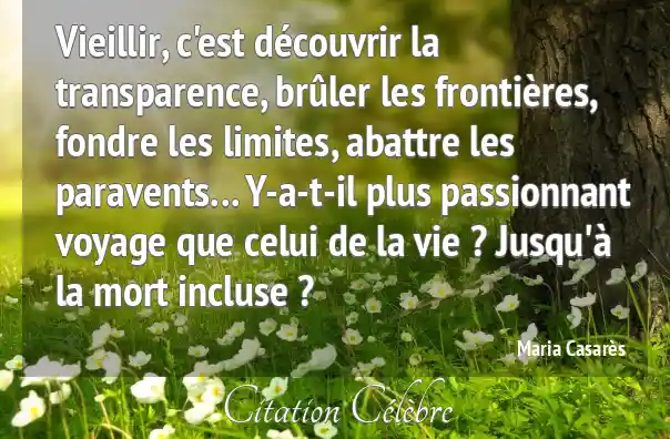 Vieillir, c'est découvrir la transparence, brûler les frontières, fondre les limites, abattre les paravents... Y-a-t-il plus passionnant voyage que celui de la vie ? Jusqu'à la mort incluse ?