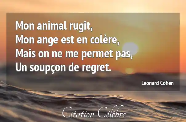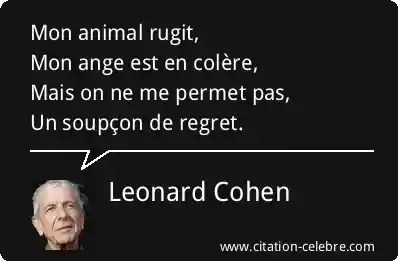 Citation Leonard Cohen mon : Mon animal rugit,Mon ange est en colère,Mais on ne me...