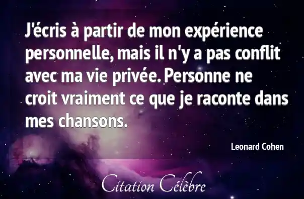 J'écris à partir de mon expérience personnelle, mais il n'y a pas conflit avec ma vie privée. Personne ne croit vraiment ce que je raconte dans mes chansons.