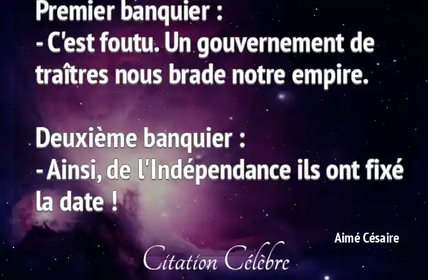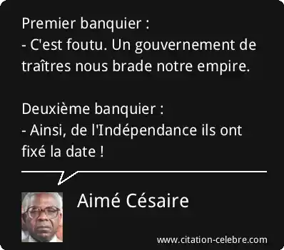 Premier banquier :- C'est foutu. Un gouvernement de traîtres nous brade notre empire.Deuxième banquier :- Ainsi, de l'Indépendance ils ont fixé la date !