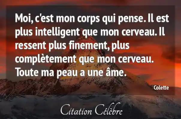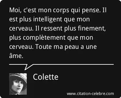 Moi, c'est mon corps qui pense. Il est plus intelligent que mon cerveau. Il ressent plus finement, plus complètement que mon cerveau. Toute ma peau a une âme.