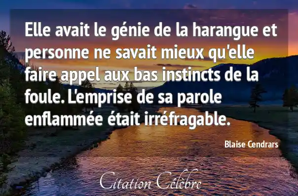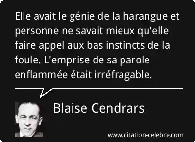 Elle avait le génie de la harangue et personne ne savait mieux qu'elle faire appel aux bas instincts de la foule. L'emprise de sa parole enflammée était irréfragable.