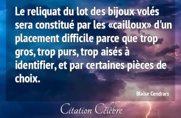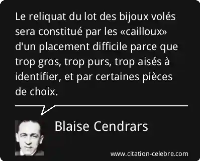 Le reliquat du lot des bijoux volés sera constitué par les «cailloux» d'un placement difficile parce que trop gros, trop purs, trop aisés à identifier, et par certaines pièces de choix.