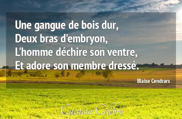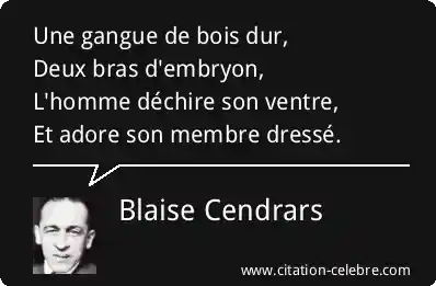 Une gangue de bois dur,Deux bras d'embryon,L'homme déchire son ventre,Et adore son membre dressé.
