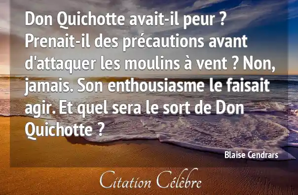 Don Quichotte avait-il peur ? Prenait-il des précautions avant d'attaquer les moulins à vent ? Non, jamais. Son enthousiasme le faisait agir. Et quel sera le sort de Don Quichotte ?