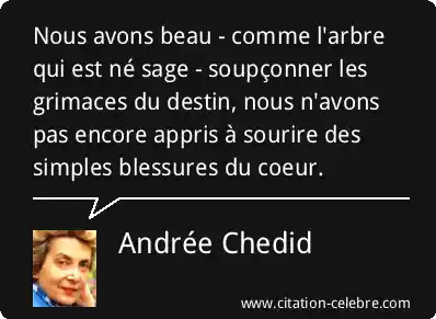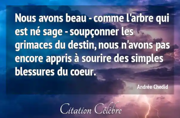 Nous avons beau - comme l'arbre qui est né sage - soupçonner les grimaces du destin, nous n'avons pas encore appris à sourire des simples blessures du coeur.