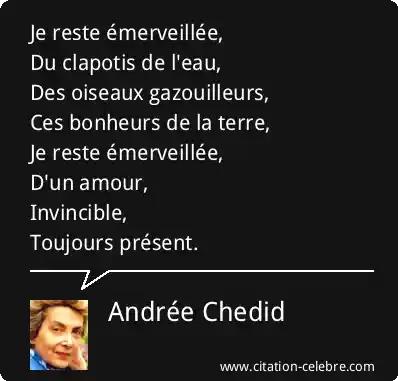 Je reste émerveillée,Du clapotis de l'eau,Des oiseaux gazouilleurs,Ces bonheurs de la terre,Je reste émerveillée,D'un amour,Invincible,Toujours présent.