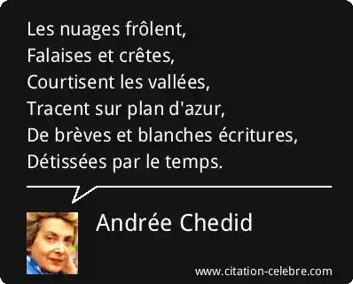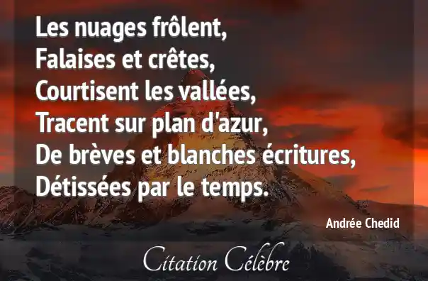 Les nuages frôlent,Falaises et crêtes,Courtisent les vallées,Tracent sur plan d'azur,De brèves et blanches écritures,Détissées par le temps.