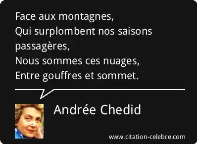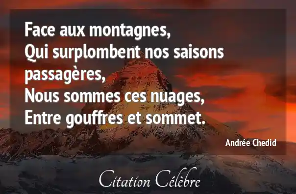 Face aux montagnes,Qui surplombent nos saisons passagères,Nous sommes ces nuages,Entre gouffres et sommet.
