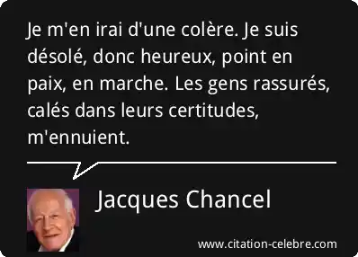 Je m'en irai d'une colère. Je suis désolé, donc heureux, point en paix, en marche. Les gens rassurés, calés dans leurs certitudes, m'ennuient.