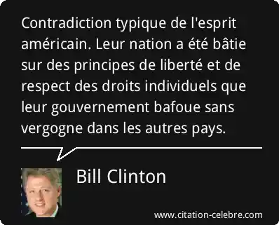 Contradiction typique de l'esprit américain. Leur nation a été bâtie sur des principes de liberté et de respect des droits individuels que leur gouvernement bafoue sans vergogne dans les autres pays.