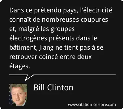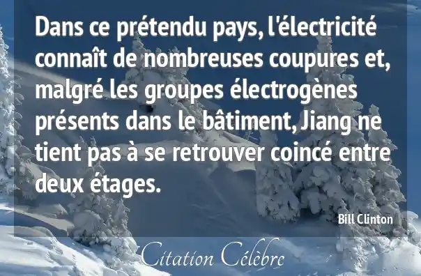 Dans ce prétendu pays, l'électricité connaît de nombreuses coupures et, malgré les groupes électrogènes présents dans le bâtiment, Jiang ne tient pas à se retrouver coincé entre deux étages.