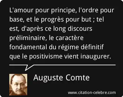L'amour pour principe, l'ordre pour base, et le progrès pour but ; tel est, d'après ce long discours préliminaire, le caractère fondamental du régime définitif que le positivisme vient inaugurer.