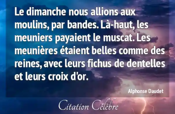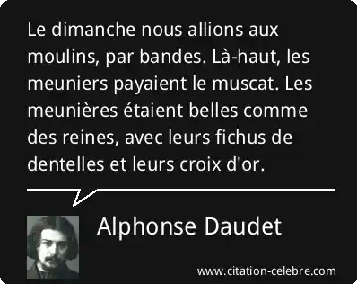 Le dimanche nous allions aux moulins, par bandes. Là-haut, les meuniers payaient le muscat. Les meunières étaient belles comme des reines, avec leurs fichus de dentelles et leurs croix d'or.