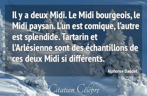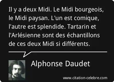 Il y a deux Midi. Le Midi bourgeois, le Midi paysan. L'un est comique, l'autre est splendide. Tartarin et l'Arlésienne sont des échantillons de ces deux Midi si différents.