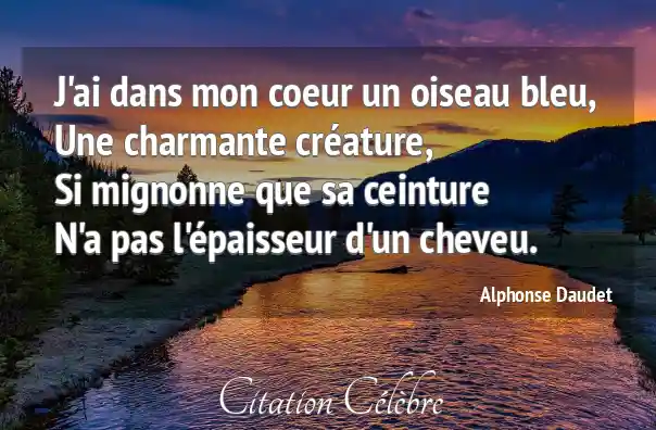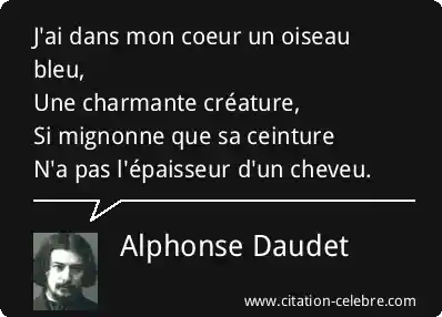 J'ai dans mon coeur un oiseau bleu,Une charmante créature,Si mignonne que sa ceintureN'a pas l'épaisseur d'un cheveu.