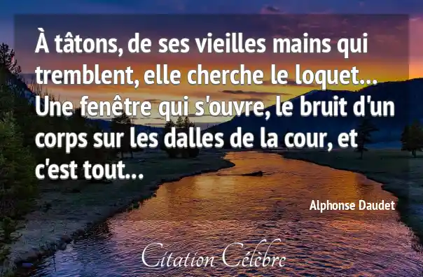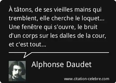 À tâtons, de ses vieilles mains qui tremblent, elle cherche le loquet... Une fenêtre qui s'ouvre, le bruit d'un corps sur les dalles de la cour, et c'est tout...