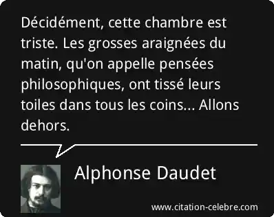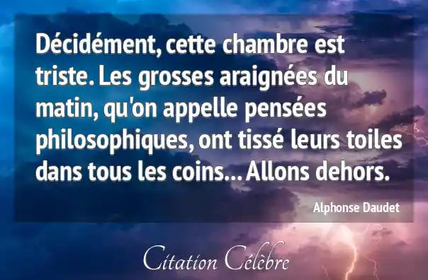 Décidément, cette chambre est triste. Les grosses araignées du matin, qu'on appelle pensées philosophiques, ont tissé leurs toiles dans tous les coins... Allons dehors.