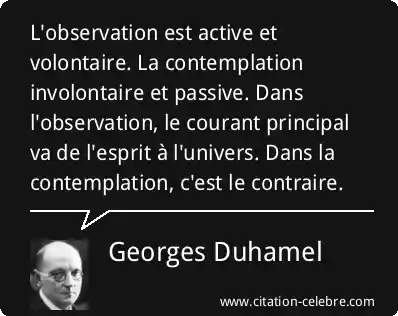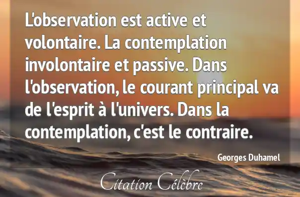 L'observation est active et volontaire. La contemplation involontaire et passive. Dans l'observation, le courant principal va de l'esprit à l'univers. Dans la contemplation, c'est le contraire.
