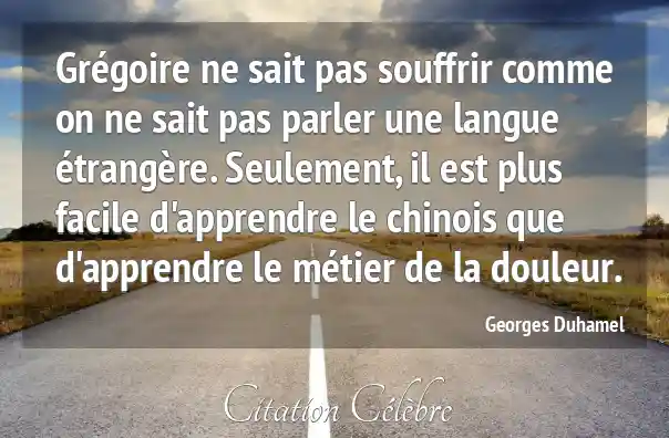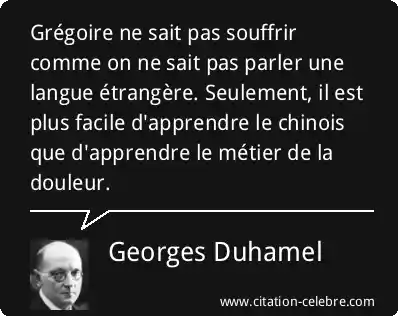 Grégoire ne sait pas souffrir comme on ne sait pas parler une langue étrangère. Seulement, il est plus facile d'apprendre le chinois que d'apprendre le métier de la douleur.