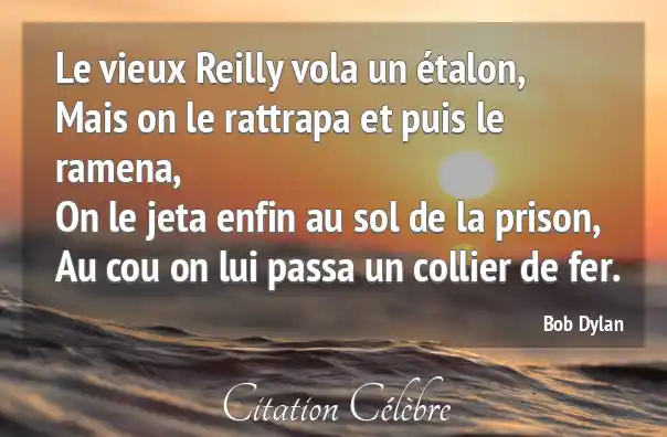 Le vieux Reilly vola un étalon,Mais on le rattrapa et puis le ramena,On le jeta enfin au sol de la prison,Au cou on lui passa un collier de fer.