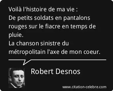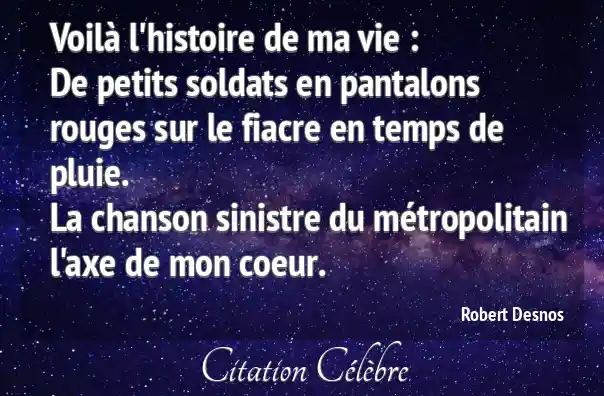 Voilà l'histoire de ma vie : De petits soldats en pantalons rouges sur le fiacre en temps de pluie. La chanson sinistre du métropolitain l'axe de mon coeur.
