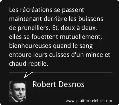 Les récréations se passent maintenant derrière les buissons de prunelliers. Et, deux à deux, elles se fouettent mutuellement, bienheureuses quand le sang entoure leurs cuisses d'un mince et chaud reptile.